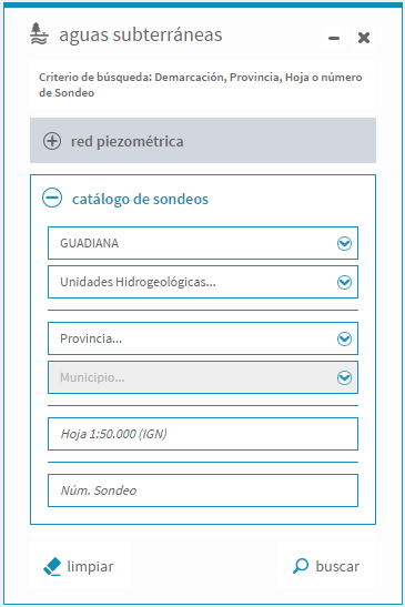 Para consultar información del Catálogo de sondeos previamente debe elegir un criterio de búsqueda. La herramienta le permite seleccionar los siguientes criterios de búsqueda: