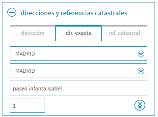 • Para realizar una búsqueda de una dirección exacta, haya que seleccionar la Provincia, Municipio, e indicar en la caja de texto el Nombre de la vía y Número de portal