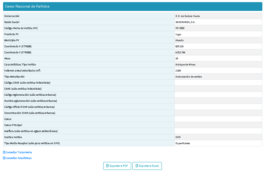 El resultado nos permite acceder a la información de los Vertidos autorizados a dominio público y/o localizarlo en el Visor de Redes de Seguimiento del Ministerio.