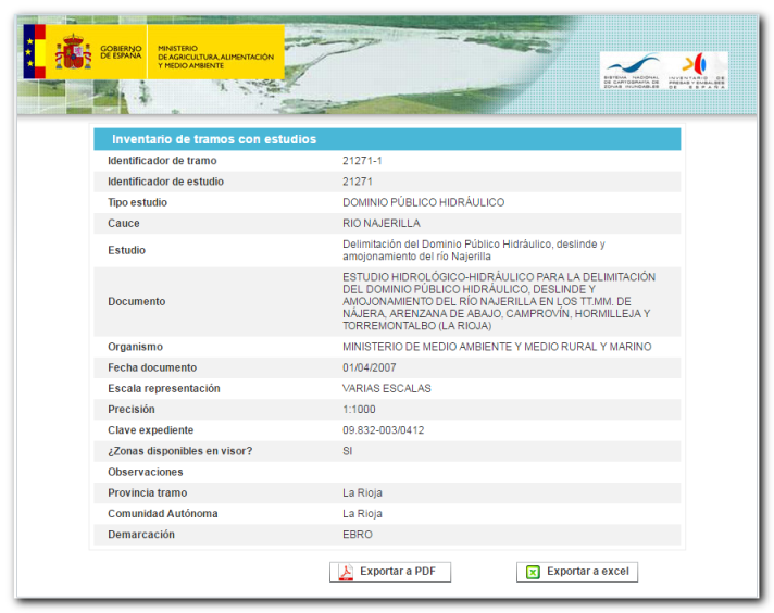El resultado nos permite acceder a la información de los Cauces de tramos de los diferentes tipos de estudio y/o localizarlo en el SNCZI-IPE del Ministerio.